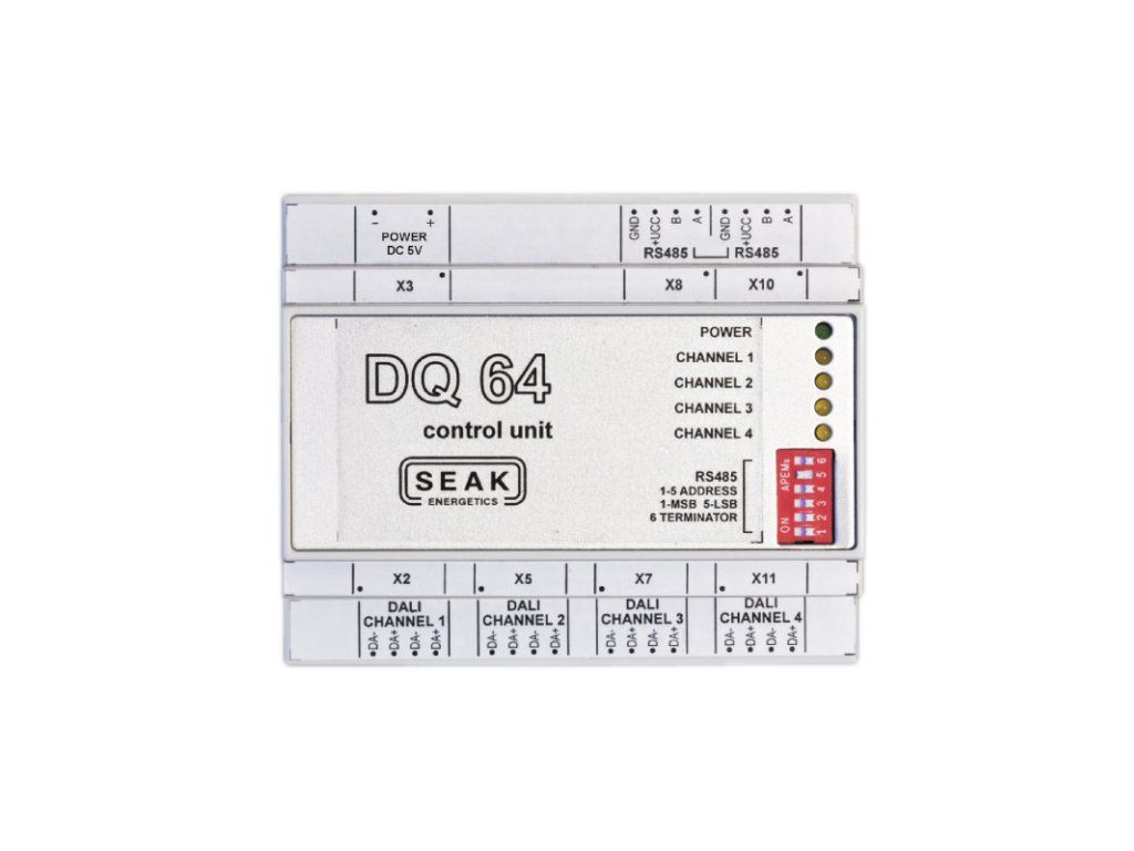 The DQ-64 converter is designed to convert control commands from the RS485 data interface to the communication protocol of a control system with an IEC62386 interface. The device enables the KDR04 control unit to communicate with luminaires in an IEC62386 data network topology. It extends the SEAK-SMART control system with the ability to control luminaires with an IEC62386 interface.