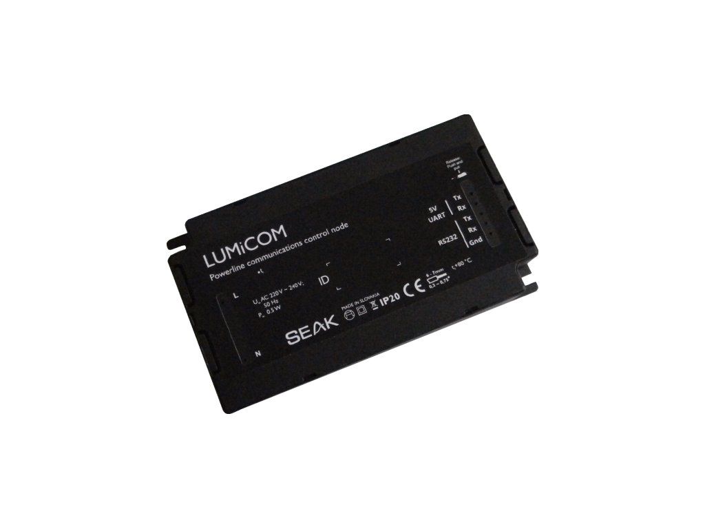 LUMiCOM 232 is a device designed to provide transparent communication with 3rd party IoT devices and sensors via existing power line. SEAK power line protocol QM-50-SSI3 is used and thus is compatible with other members of SEAK LUMi family.